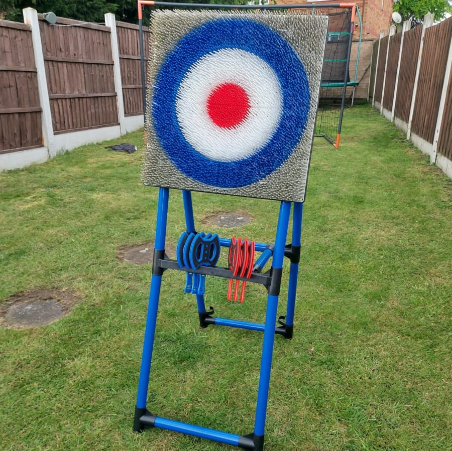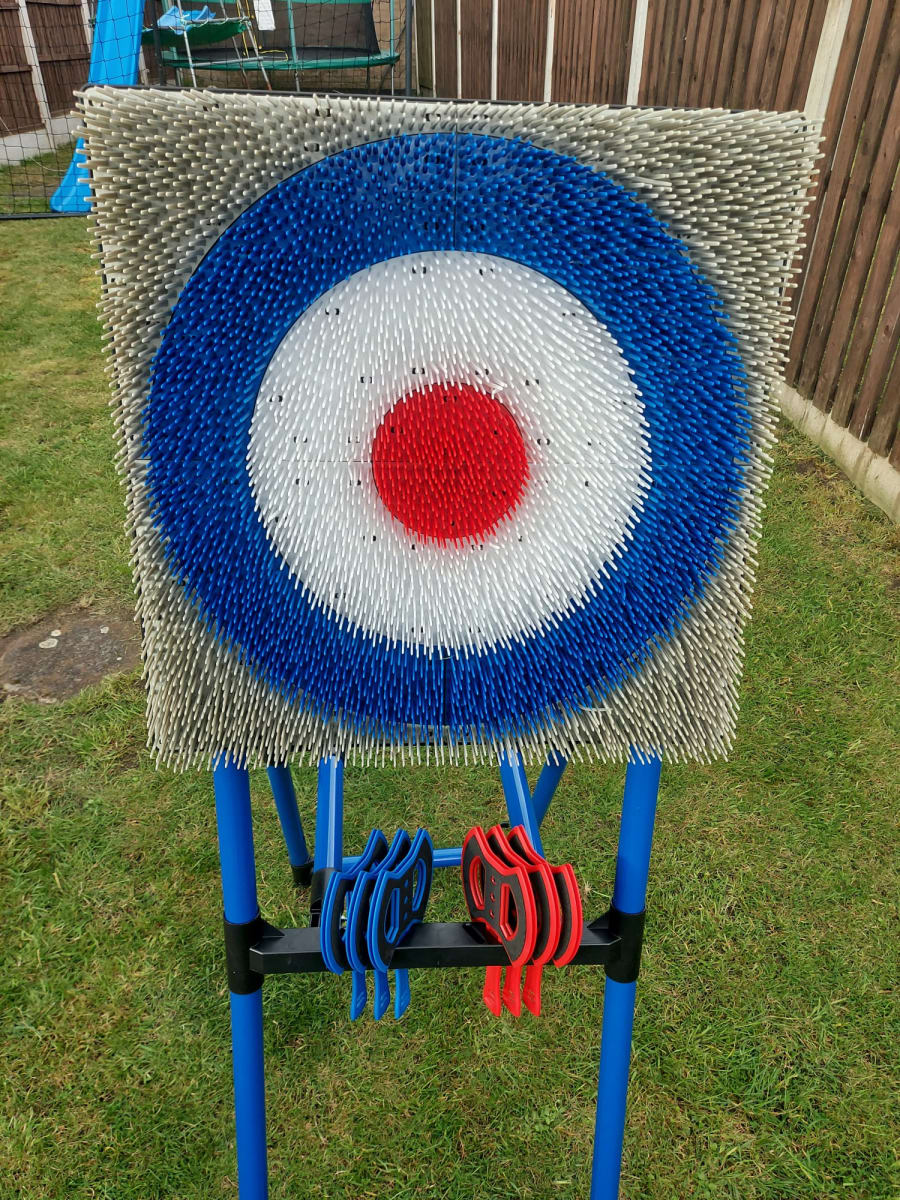 The aim of the game is to hit or as get as close to the bullseye as possible using three axes. We provide 6 axes in total, 3 of one colour and 3 of another. This allows for a 1v1 game!