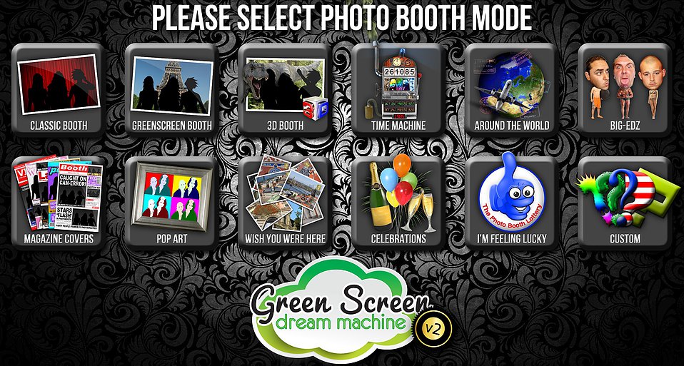 Our sit down photo booth will be set to The Green Screen Dream Machine functionwith amazing selectable green screen backgrounds and modes giving over 1000 background/print combinations. The most advanced green screen booth in the world features a massive choice of modes all selected by your guests from the touchscreen menu. These modes include: